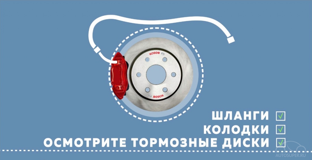 - Не стоит забывать и о проверке температуры кипения тормозной жидкости, давлении в шинах и целостности протектора.