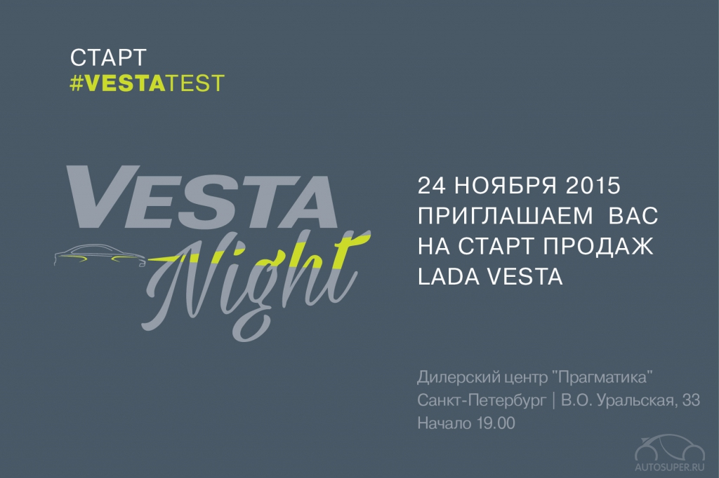 24 ноября 2015 года в дилерском центре «Прагматика» состоится торжественное мероприятие #Vestanight. Именно в этот вечер по всей России стартуют официальные продажи самой ожидаемой новинки года - автомобиля новой дизайн-концепции LADA Vesta. И именно в этот вечер будет раскрыта главная интрига - стоимость и комплектация машины, чьи характеристики высоко оценил лично президент России Владимир Путин. На презентации Вы сможете пообщаться с руководством