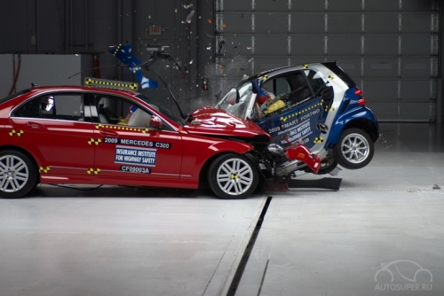Аналогичная ситуация была зафиксирована и при столкновении С-класса от Mercedes и миниатюрного Smart ForTwo. Крошечные размеры сыграли с ним злую шутку. При ударе о полноразмерный седан панель приборов и рулевая колонка Smart оказались в салоне, а пассажиры получили серьезные повреждения. Кроме того, автомобиль развернуло на 450 градусов.