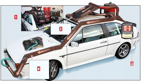 Далее горючий газ поступает в большой радиатор на крыше автомобиля, где охлаждается. Затем смесь возвращается обратно в багажник - в двойной фильтр (циклон плюс пористый), который задерживает смолы и твердые частицы. После этого биогаз через длинный и извилистый "дымоход" поступает в моторный отсек и направляется в цилиндры ДВС, где и сгорает.