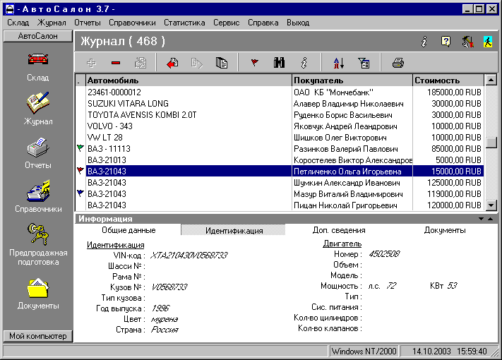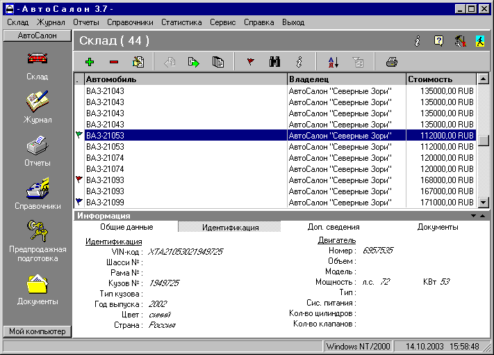- Изменения в Интерфейсе в значительной степени облегчают общение пользователя с программой. Например, при перемещении по Складу или Журналу можно видеть подробную информацию о текущем автомобиле (идентификационные данные, сведения о документах, информация о покупателе и комитенте и т.д.).