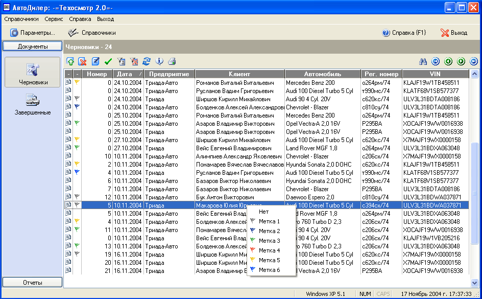 - Справочник по автомобилям клиентов, содержащий перечень автомобилей с указанием их идентификационных номеров и принадлежности конкретным клиентам;