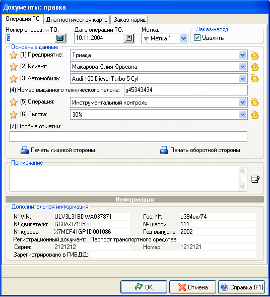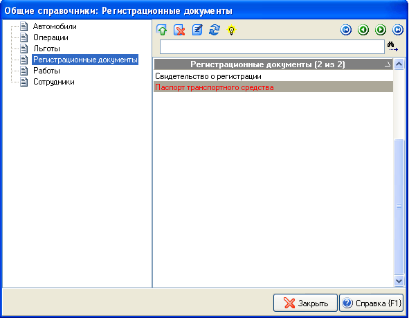 - Общие справочники (по автомобилям, операциям, льготам, регистрационным документам, работам) с возможностью редактирования справочников и установки значений "по умолчанию";