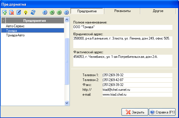 - Справочник по предприятиям. Существует возможность добавлять, удалять, редактировать предприятия, устанавливать предприятие "по умолчанию";