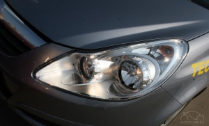Внешний вид первого «пациента», то есть я, конечно, хотел сказать, экстерьер Opel Corsa, нареканий не вызывает. Несмотря на то, что автомобильчик и на расстоянии, и вблизи выглядит форменным карликом, штамповка рубленых кузовных панелей придает силуэту почти что спортивные черты. В том же направлении заставляют думать и 17-дюймовые диски, и нисходящий динамичный силуэт передних и задних крыльев. Кроме того, «пациент» явно отличается повышенной любознательностью - достаточно узкие и конструктивно сложные фары, сильно вытянутые кверху, и округлый массивный передний бампер при разглядывании машины анфас создают стойкое ощущение заинтересованного взгляда последней в вашем направлении.