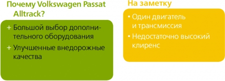 Самым новым представителем сегмента можно считать дебютировавший на российском рынке Volkswagen Passat Alltrack, поднявший возможности классического Passat на новый уровень. В отличие от универсала Variant, вседорожник Alltrack щеголяет новыми бамперами, расширенными колесными арками, увеличенным на 30 миллиметров клиренсом и большими углами въезда и съезда. До Tiguan он, конечно, не дотягивает, но может стать ему неплохой альтернативой.