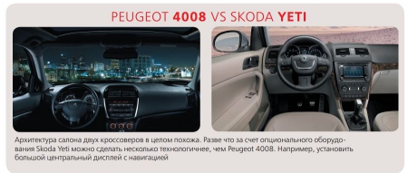Архитектура салона двух кроссоверов, в целом, похожа. Разве что за счет опционального оборудования Skoda Yeti можно сделать несколько технологичнее, чем Peugeot 4008. Например, установить большой центральный дисплей с навигацией.