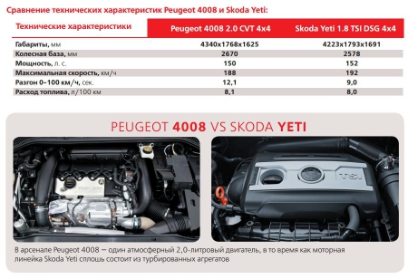 Так что, у каждой модели найдется свой список достоинств и недостатков. И даже тот факт, что Skoda Yeti на несколько лет старше своего нового конкурента, не дает Peugeot 4008 безоговорочного лидерства.