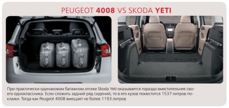 При практически одинаковом багажном отсеке, Skoda Yeti оказывается гораздо вместительнее своего одноклассника. Если сложить задний ряд сидений, то в его кузов поместится 1537 литров поклажи. Тогда как Peugeot 4008 вмещает не более 1193 литров.