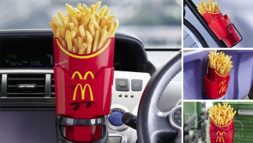 В Японии в McDonald's Auto теперь каждый водитель в праве рассчитывать на подарок. Совершенно бесплатно покупатель получает держатель для упаковки картофеля фри, рассчитанный на большую порцию.